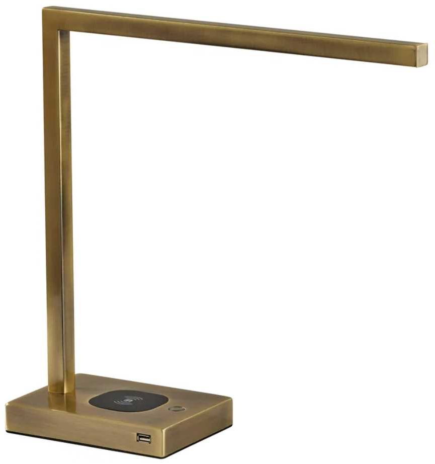 The 16"" tall Aidan AdessoCharge LED Wireless Charging desk lamp does double duty, illuminating your space with a modern flair while providing a convenient and stylish charging station for your devices. This compact desk lamp makes a big statement with its clean, rectangular lines and all-over antique brass finish.Read More