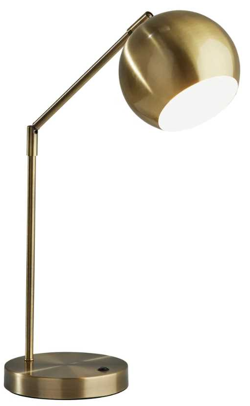The Ashbury desk lamp is also available in a black finish with antique brass accents. While the 6.5" globe-shaped shade directs light from a 40W bulb (not included) through a 4.6" opening. Just as versatile as it is aesthetic, the lamp features two articulation points, one along the stem allowing for large adjustments to the lamp height and another located at the base of the shade to provide pinpoint directional lighting. For convenient access to power right from your desktop, the 7" diameter round base features an AC outlet. Whether the lamp is turned on or off, the AC outlet will keep working normally. Operated by a rocker switch located on the base, the lamp also features a 5' clear cord.
