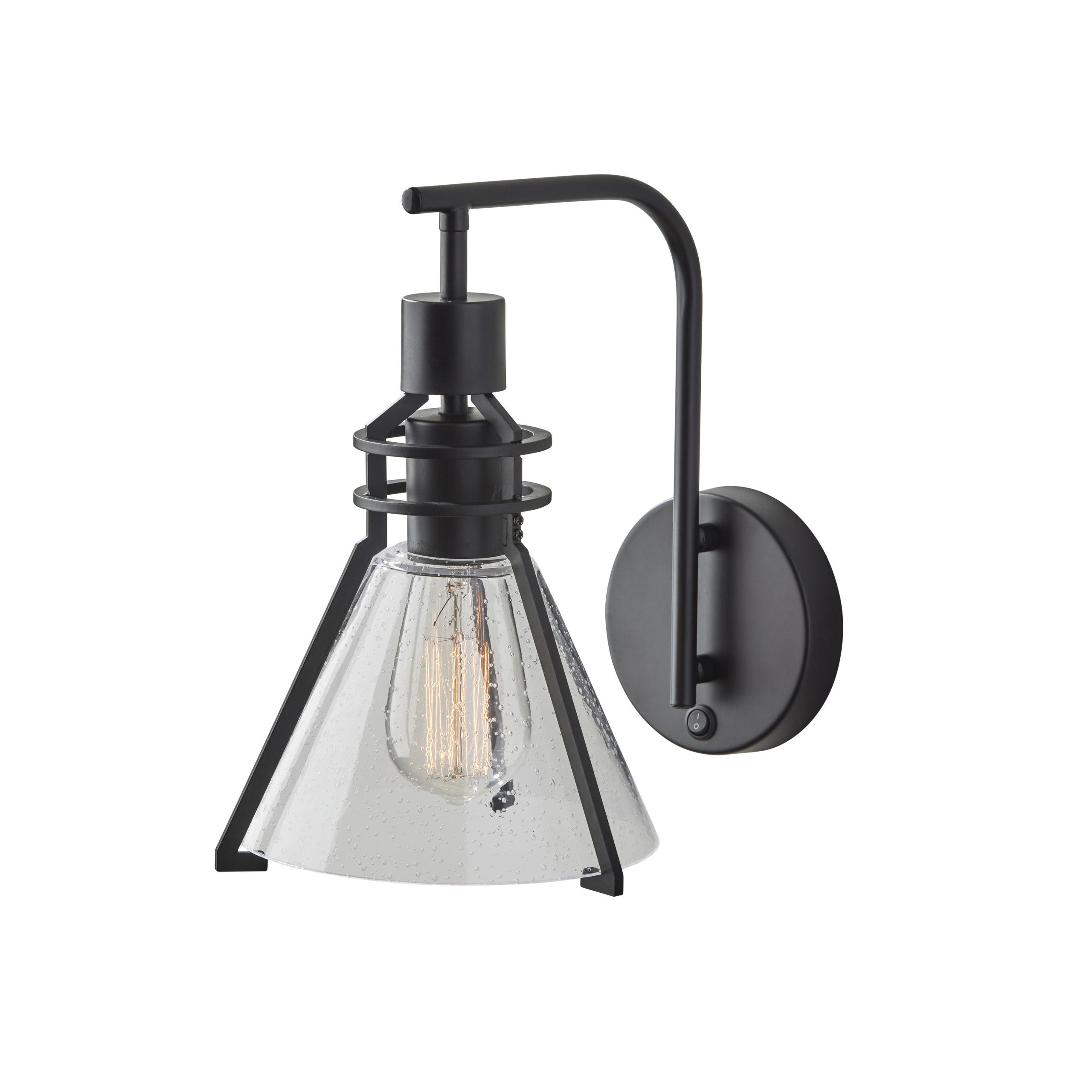 Defined by elegant lines and a blend of modern and vintage styling, the Beckett lamp adds a polished look to your wall. For décor-enhancing symmetry, pair two of these sconces on either side of beds, fireplaces, or mirrors or place individually in entryways or other spaces for a pop of light. The metal shade frame in black finish consists of three arms that secure an inverted cone-shaped shade of clear, seeded glass. For a distinctive vintage look, the clear shade leaves the included 60W Edison bulb visible. To easily turn the lamp on or off, a rocker switch is located on the round black metal wall plate. This item is also compatible with wall dimmers if needed. Complete your space’s look with the coordinating Beckett floor lamp, desk lamp, and pendant lighting.Read More