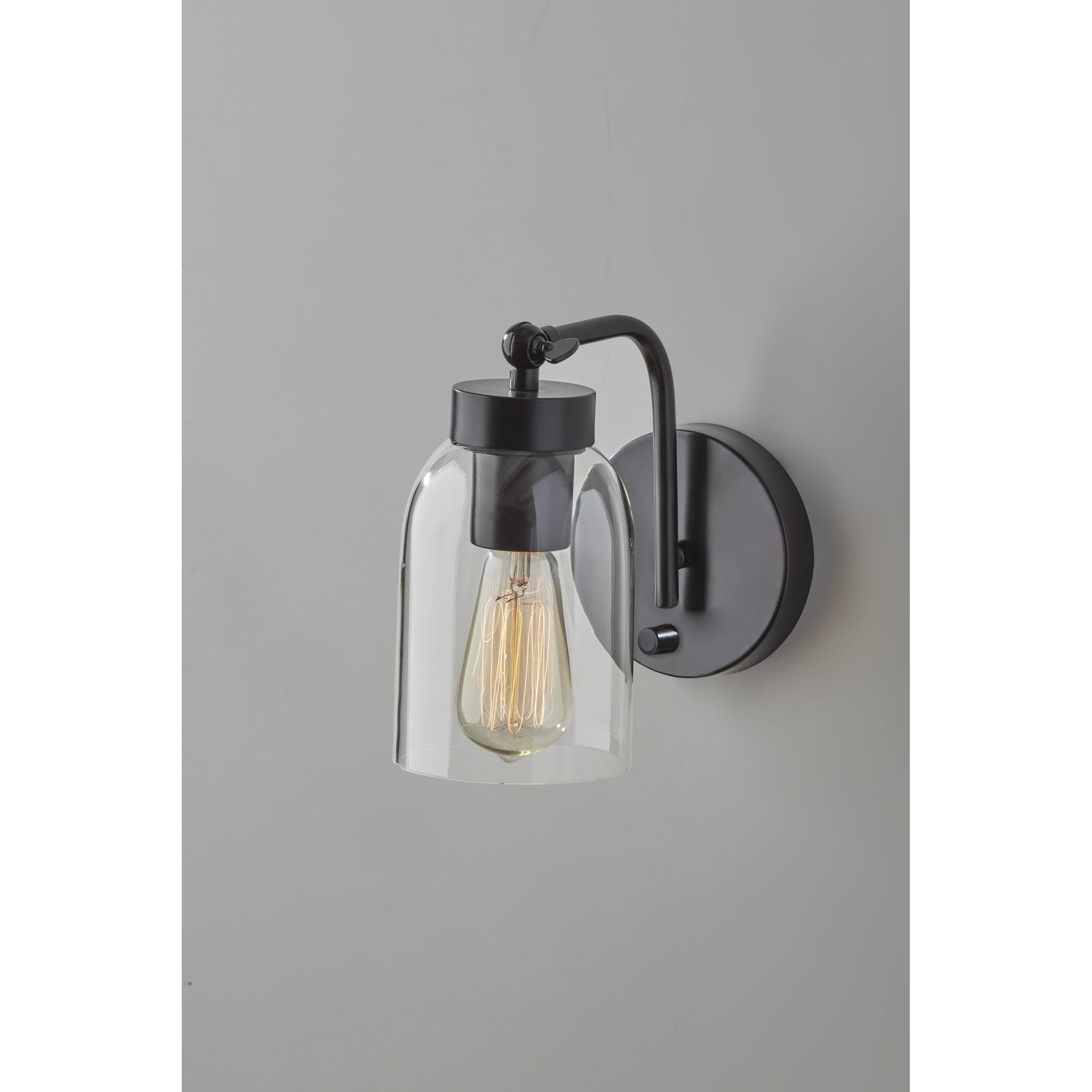 Brighten any wall with the mid-century modern styling of the Bristol wall lamp, crafted of clear glass with a black metal base, arm, and socket. The dome-shaped shade is made of clear glass, exposing the included decorative 40W vintage Edison bulb. This lamp also features an articulation point at the base of the shade, allowing you to direct the light wherever it’s needed, and is operated by a rotary switch located on the 5″ diameter round base. This lamp is also compatible with wall dimmer switches. Pair two of these vintage-inspired sconces on either side of beds, fireplaces, or mirrors for décor-enhancing symmetry, or place individually in entryways or other spaces for a pop of light. The Bristol wall lamp is also available with an antique brass finish.Read More