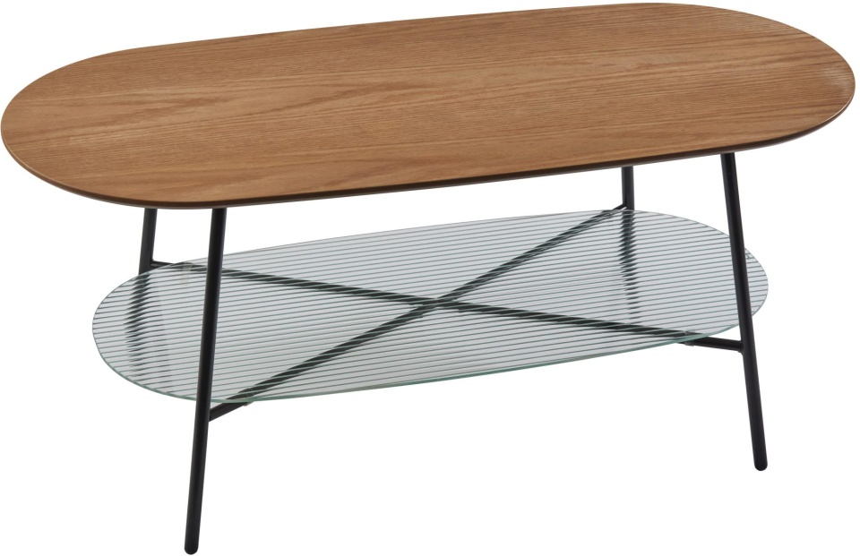 The Diane coffee table is a contemporary, mixed material option to upgrade your living space design. This two-tiered oval table features a natural oak wood veneer top as well as a lower shelf of clear ribbed glass for displaying your favorite books and accent pieces.Read More