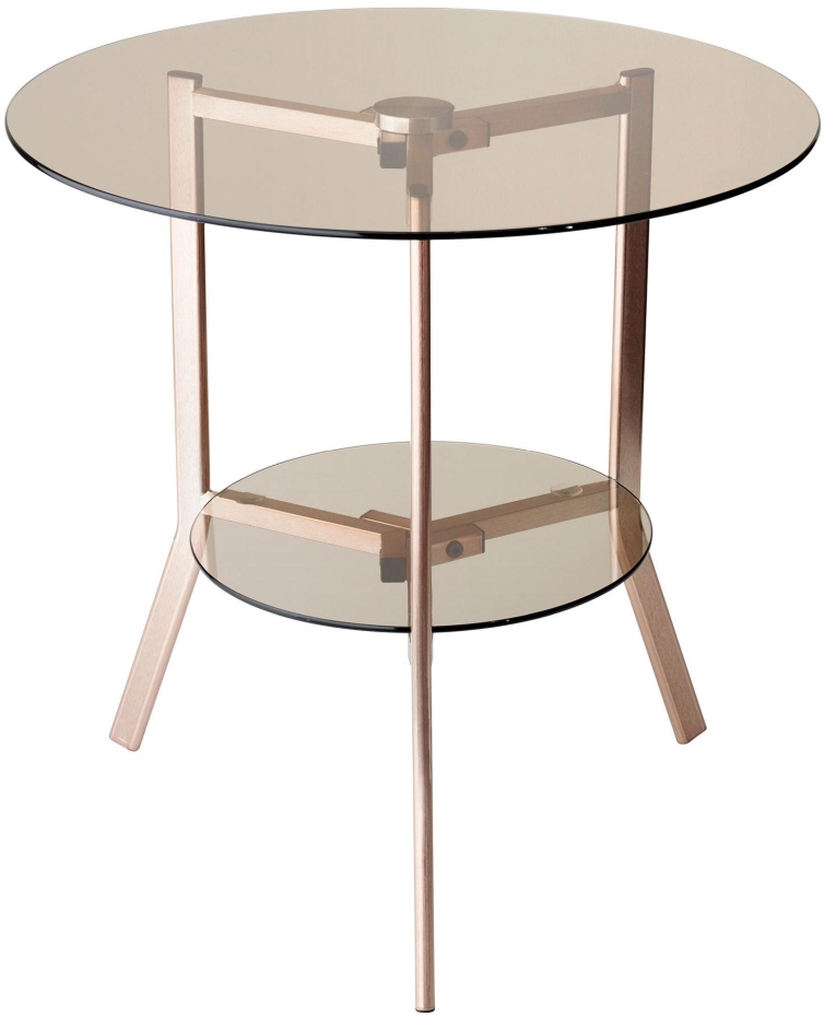 Compliment modern or transitional themed room decor with the Gibson End Table. Bent brushed copper legs form a sleek tripod stance, supporting two tinted glass table tops for extra storage space.Read More