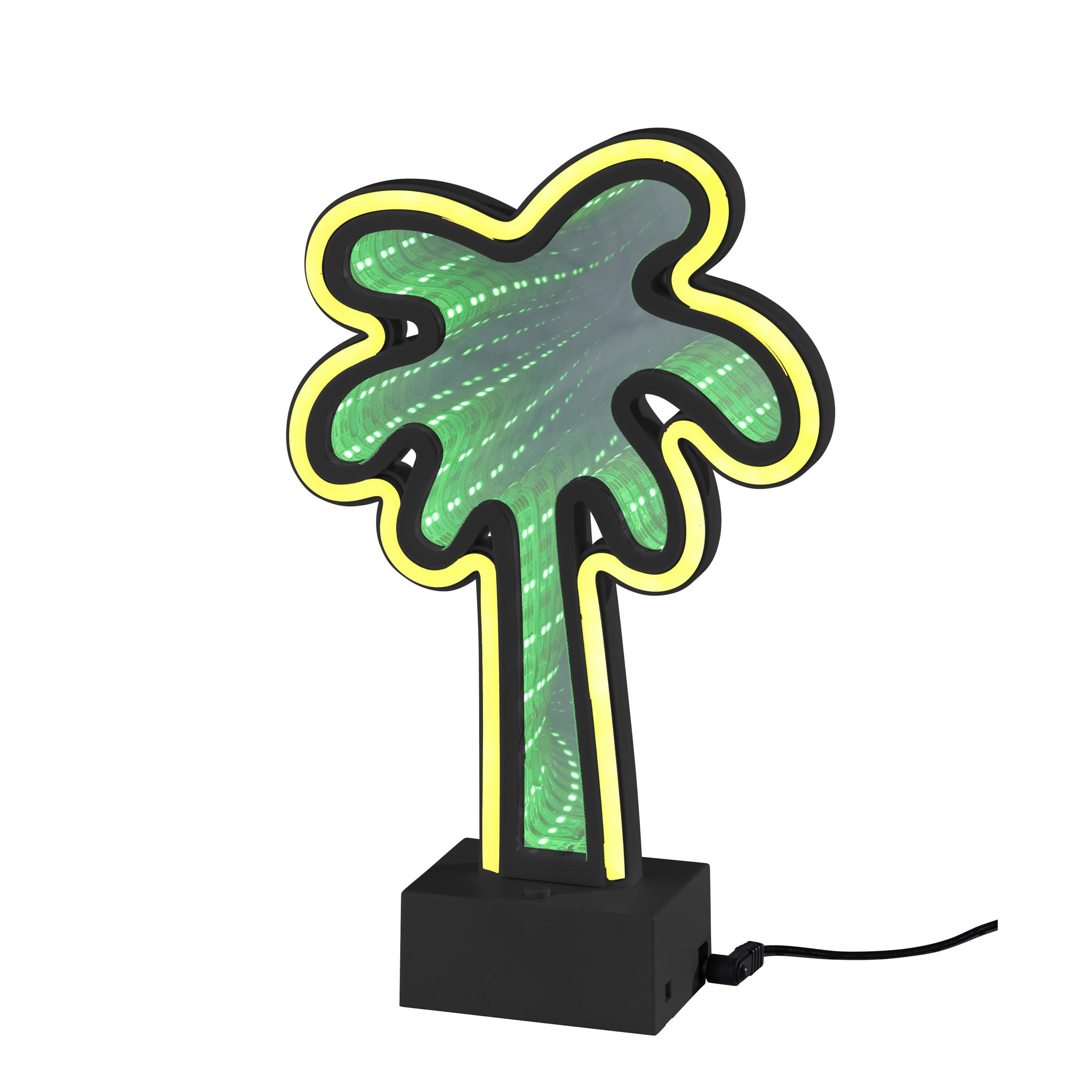 Enjoy tropical vibes with this bold Simplee Adesso Infinity Neon Palm Tree light that brings a retro feel with a modern twist to any space. Its black, rectangular plastic base houses three “AA” batteries (not included), making it easy to add a fun and stylish glow to any table, desk, or shelf without the mess of a cord. You can alternatively power the light with the included 8′ USB cable for unlimited use without needing to worry about replacing batteries. For added versatility, the light comes with mount holes located on the back of the base for mounting to a wall, creating contemporary wall art. Made of mirrored plastic with a neon border, this 10.5″ high and 6.5″ wide piece includes a 1W LED light operated by a 4-way push button switch, letting you alternate between a solid neon yellow border light only, infinity psychedelic green all-over light only, or both lights. Even with the light powered off, the stylish palm tree detail creates an eye-catching retro look and can function as a mirror.Read More