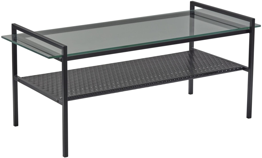 Add a stylishly fashionable feel to your living space with the two-tiered Pearson coffee table. With matte black legs that frame the top, this 14.5" tall table also features a clear glass top and a matte black woven metal shelf for displaying your favorite books and accent pieces.Read More