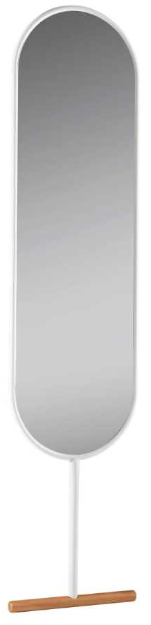 This Willy leaning mirror features a minimalist white metal frame, while its walnut-colored beechwood stick-shaped base presents a modern touch to this classic product.