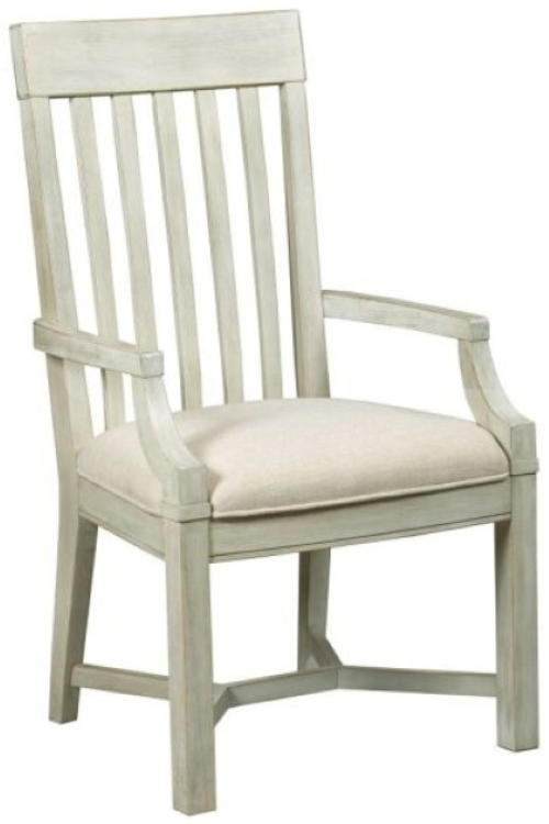 The collection features thick oak veneers in a driftwood finish against the soft texture of sun-washed paint. Slat back arm chair will fit nicely with any of the dining tables. Upholstered seat in an ivory fabric finishes off the dining chair.Read More