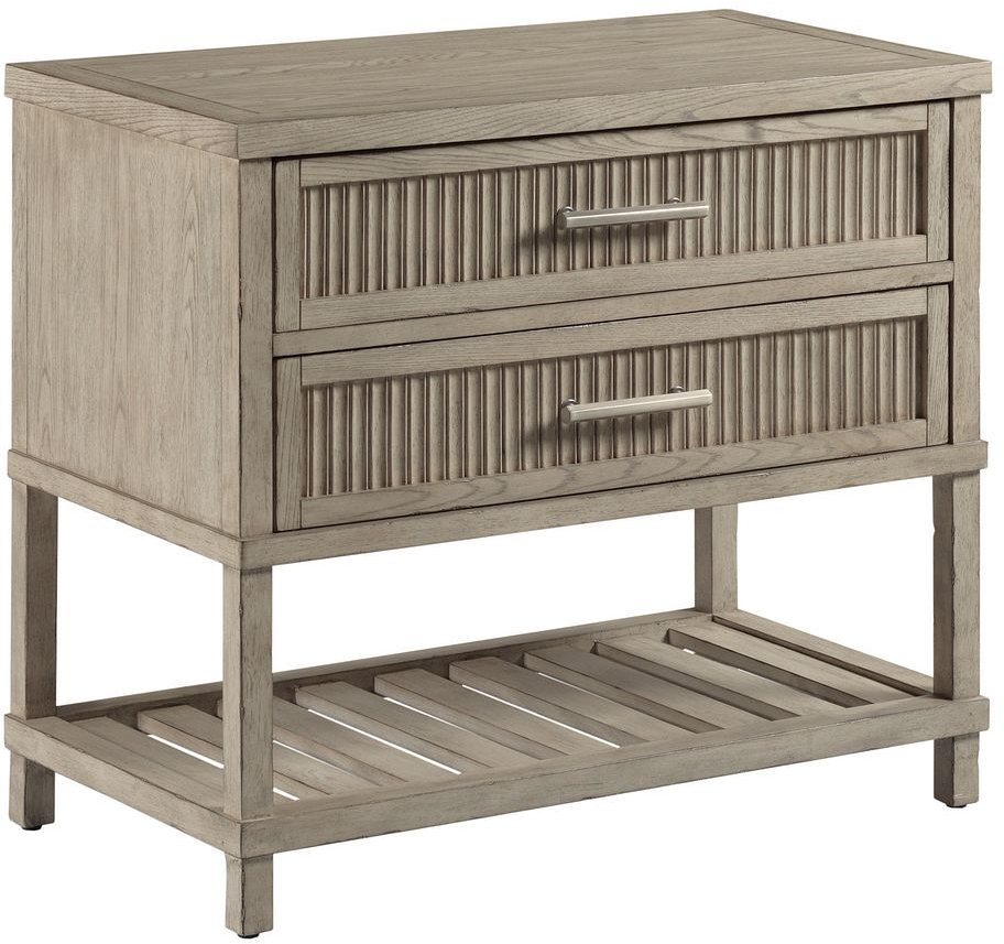 Harrison night stand has a textured surface with two drawers and a slatted bottom shelf for storage. Perfect complement to any bedroom setting. Inspired by a favorite spot in the Montana Bitteroot's, the West Fork collection reflects a laid-back, natural style for those seeking a casual decor.Read More