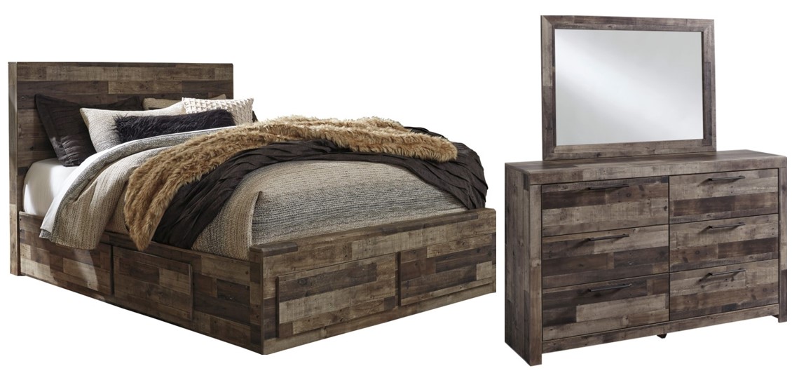 Includes panel storage bed (headboard, 2-drawer storage footboard, rails and slats) and 6-drawer dresser with mirror