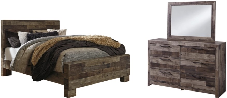 Includes panel bed (headboard, footboard and rails) and 6-drawer dresser with mirror
