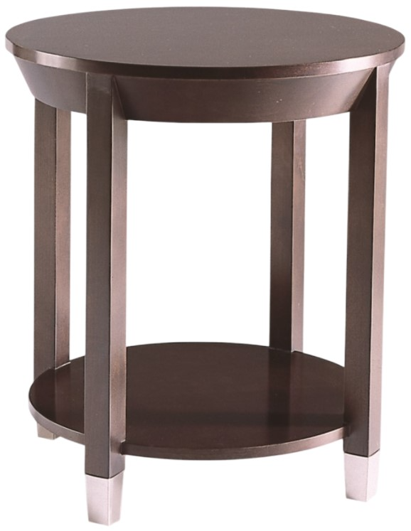 Simple yet very stylish, this 24 inch diameter side table features a tapered bezel-like apron around the top, a great detail, and has additional surface area provided by the lower shelf. The four legs are finished with nickel ferrules.Read More