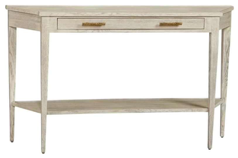 The Fulton Collection is constructed of oak solids and quartered sawn oak in an artisan hand-worked grey finish. This 19th-century Italian neo-classical design has a shaped top with a center drawer and lower shelf. The finish is an earth gray contrasted with the champagne textured hardware.Read More