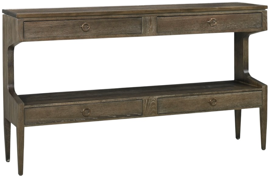The Hayes features a sophisticated mid-modern style with overall clean lines and shaped sides tucked in at the waist. Accented with aged bronze hardware and metal trim, the console table has 4 individual drawers for discreet storage.Read More