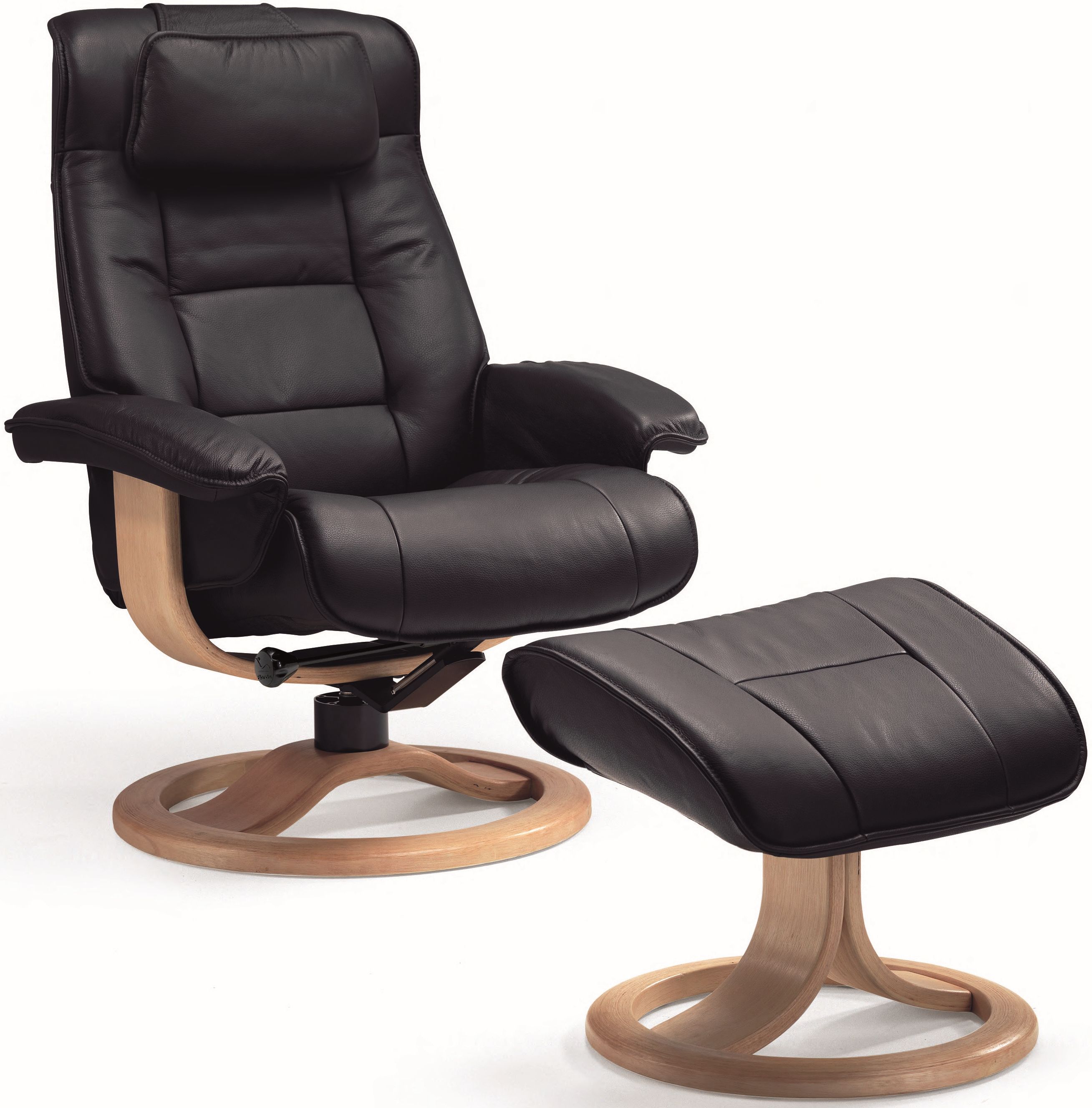 The base is produced in laminated, stained wood which gives it an elegant character. Available in all our leathers and select fabrics, Mustang features a moveable neck pillow. The chair is available in two sizes, small and large.