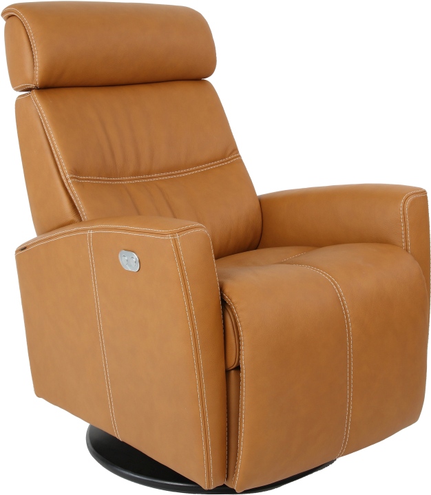 Fjords® Milan swing relaxer, featuring an adjustable height and angle headrest, makes the seating experience ergonomic and gives your lower back correct support. Available in all our leathers and select fabrics, Milan is a swivel/glider/rocker recliner available in motorized and manual versions. The design is available in two sizes, small and large. Black base is standard on Milan.