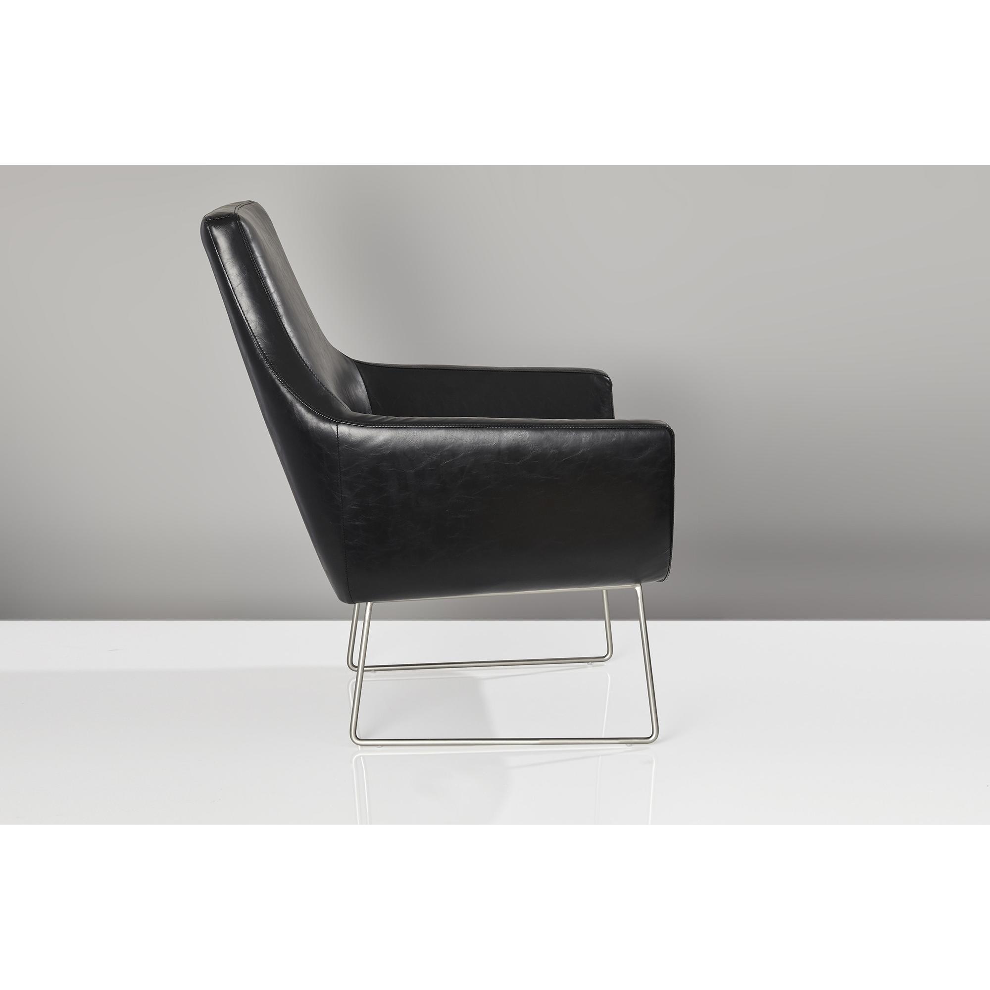 An open, reclined shape with thin, brushed steel legs, the Kendrick chair lightens up contemporary style with airy ambiance. Smooth clean lines are both modern and industrial. The beauty of this collection lies in its simplicity. A slight distressed look on a black PU Leather covering provides an interesting variation to the sleek, smooth steel base. A weight capacity of 350 pounds is recommended for this item. With an interior seat width of 22.5″, a seat depth of 21″, and seat back height of19.5″, the Kendrick Chair is a spacious and comfortable option. Overall dimenstions are 33″W x 30.5″D x 37″H.Read More