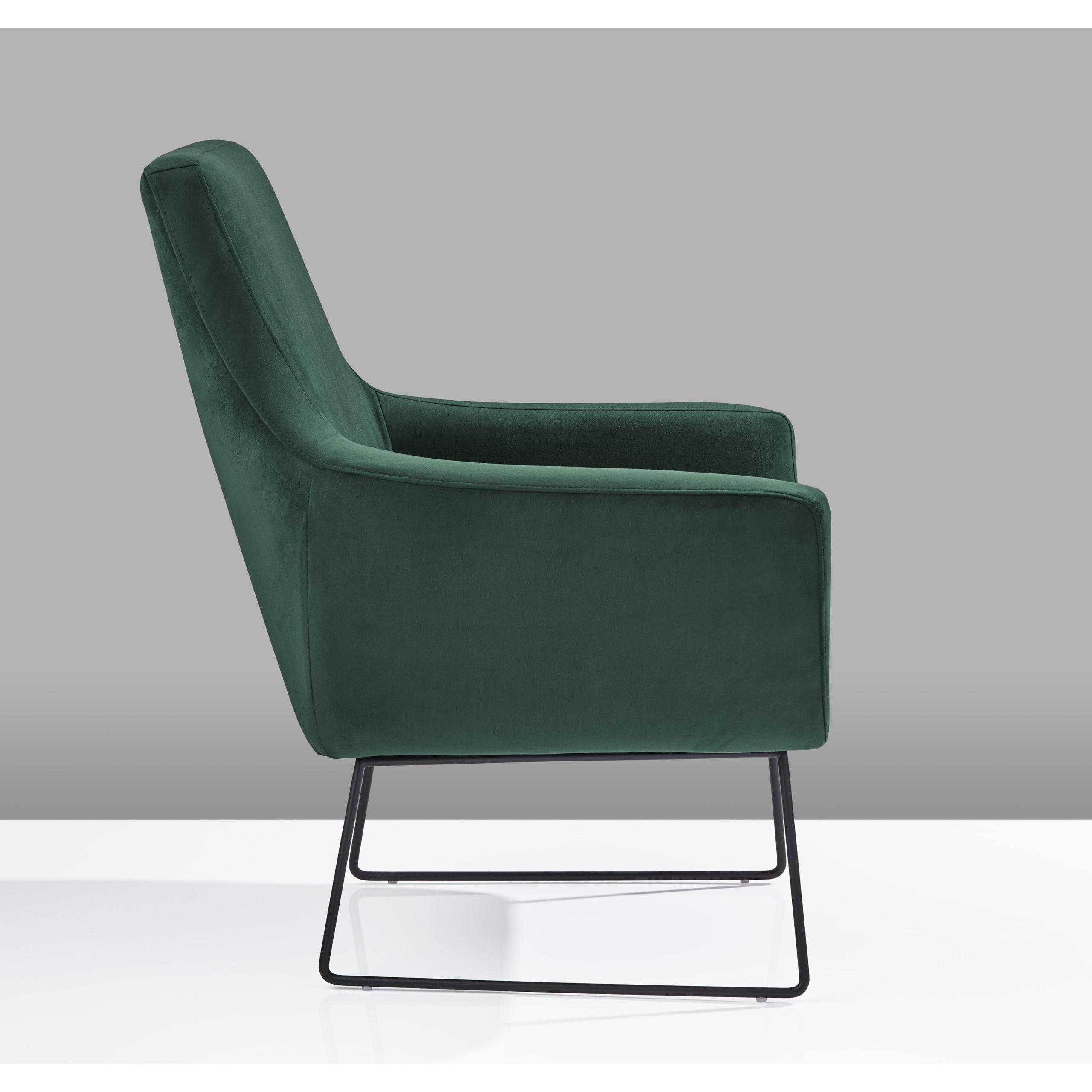 An open, reclined shape with thin, matte black legs, the Kendrick chair brightens up any style with and airy and playful ambiance. Smooth clean lines are both modern and industrial. The beauty of this collection lies in its simplicity. A deep green velvet fabric covering provides an interesting variation to the sleek, smooth steel base. A weight capacity of 350 pounds is recommended for this item. With an interior seat width of 22.5″, a seat depth of 21″, and seat back height of19.5″, the Kendrick Chair is a spacious and comfortable option. Overall dimensions are 33″W x 30.5″D x 37″H.Read More