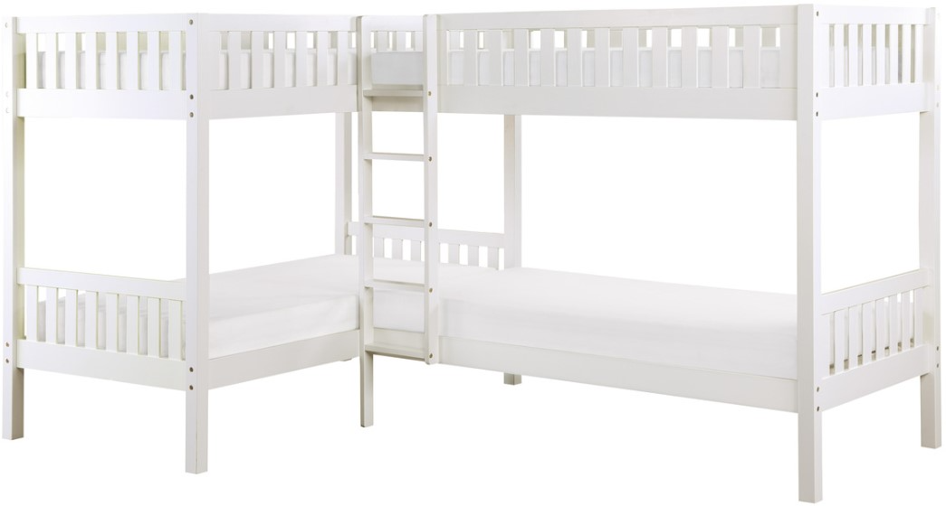 The Homelegance® Galen Corner Bunk Bed features a white finish, a sturdy ladder leading to the top bunk, and is made of wood and engineered wood. Maximizing sleep space is achieved with the stylish Galen Collection.Read More