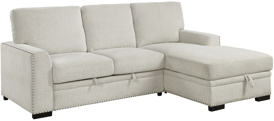 Covered in beige chenille, the modern profile of this seating group is defined by its nailhead trim, loose back cushions and track-style arms. Conveniently stored beneath the sofa is a pull-out trundle that rises to create a bed while the top of the attached chaise opens to reveal under-seat storage.Read More