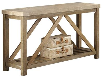 Industrial styling is softened by the blending of natural elements to create a stylish look in the Ridley Collection. A creamy white stone marble top of the sofa table is supported by the weathered wood finished base of each table – comprised of wood framing that includes display shelving with slat construction and angled supports. Cocktail table and end table are also available.Read More