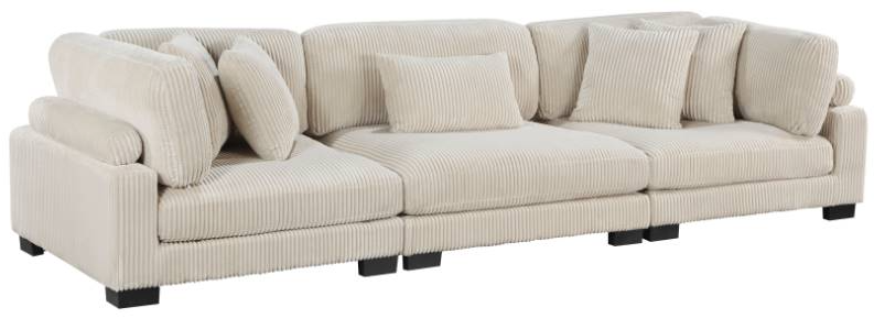 Configurable to your available space, the Traverse Collection allows for the addition and detachment of pieces for a customized seating experience. The sofa configuration consists of two corner units paired with a centrally placed armless chair. The plush beige corduroy fabric upholstery creates a plush expanse for a soft touch experience.Read More