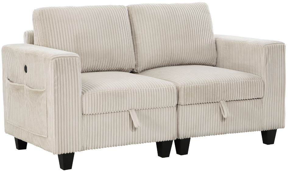 Pull-out storage drawers are neatly tucked beneath the seats of the love seat, each drawer easily accessible with a pull to the front-mounted loop handle. The paired end seats arm's provide side support and power charging ports. The collection is covered in beige corduroy fabric for a neutral complement to your home’s décor.