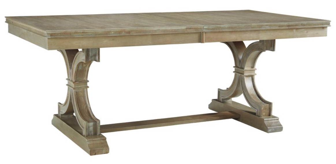 Complete your dining room design with this Cosmopolitan Double Trestle Dining Table from John Thomas. This dining table features a taupe gray finish and has two self storing extension leaves. This piece will definitely elevate the look of your dining room.Read More