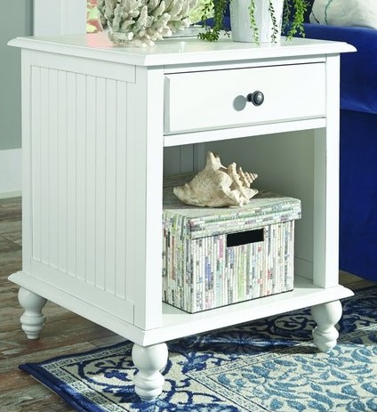 The Cottage end table features a beach white finish, and a large storage drawer. All wood construction and it's unique design give the Cottage collection a timeless style.Read More