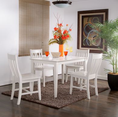 John Thomas Simply Linen Leg Dining Room Table and Chairs Set with two finish colors and slatted back design on chairsRead More