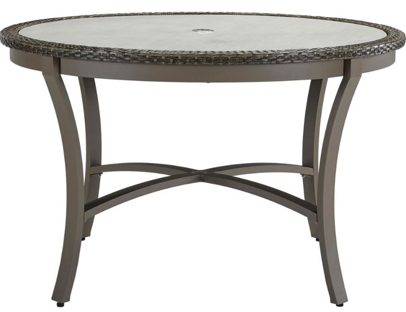 Features: Hand-woven classic basketweave contrasted by the decorative plaited chevron design. Aluminum table top in a powder-coated faux travertine finish. Seats 4. 2” Umbrella hole. Base stretcher provides umbrella pole support.