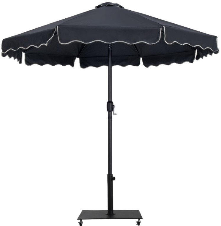 Escape from the sun's rays when you're basking beneath this Amalfi black fabric with cream piping and matte black aluminum patio umbrella with base set. On casters to make it a simple feat to move it from spot to spot.Read More