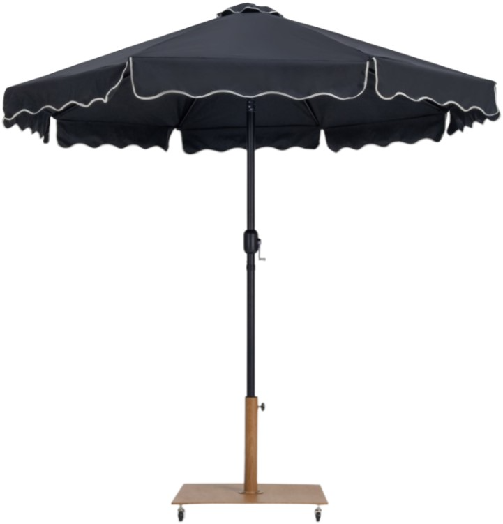 Escape from the sun's rays when you're basking beneath this Amalfi black fabric with cream piping and matte black aluminum patio umbrella with teak base set. On casters to make it a simple feat to move it from spot to spot.Read More