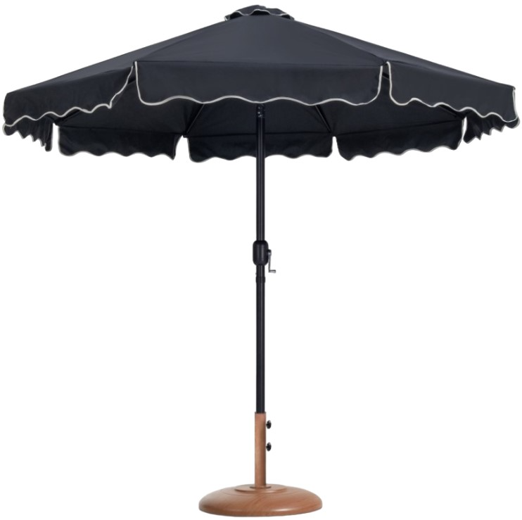 Escape from the sun's rays when you're basking beneath this Amalfi black fabric with cream piping and matte black aluminum patio umbrella with teak base set. This umbrella and stand is an ideal option for adding shade to any area of your deck or patio.Read More