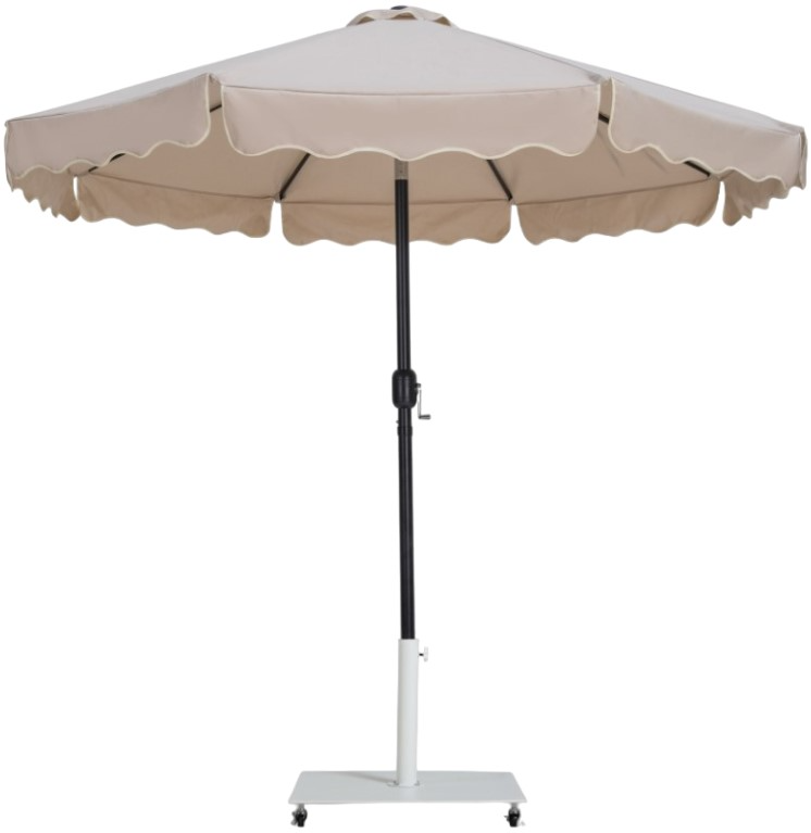 Escape from the sun's rays when you're basking beneath this Amalfi beige fabric with cream piping and matte white aluminum patio umbrella with base set. On casters to make it a simple feat to move it from spot to spot.Read More