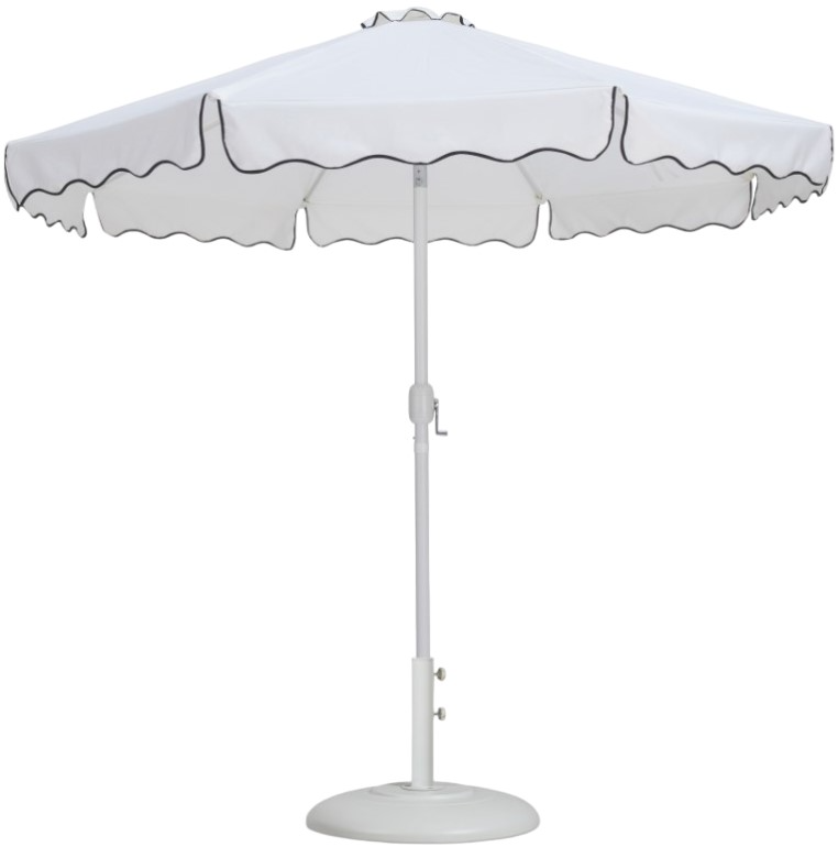 Escape from the sun's rays when you're basking beneath this Amalfi white fabric with black piping and matte white aluminum patio umbrella with base set. This umbrella and stand is an ideal option for adding shade to any area of your deck or patio.Read More