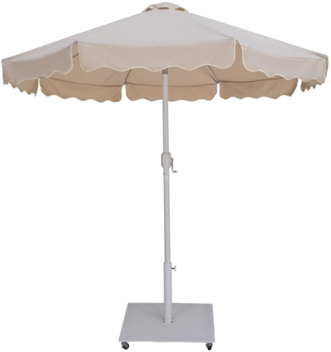 Escape from the sun's rays when you're basking beneath this Amalfi beige fabric with cream piping and matte white aluminum patio umbrella with base set. On casters to make it a simple feat to move it from spot to spot.Read More