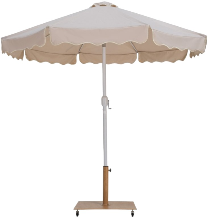 Escape from the sun's rays when you're basking beneath this Amalfi beige fabric with cream piping and matte white aluminum patio umbrella with teak base set. On casters to make it a simple feat to move it from spot to spot.Read More