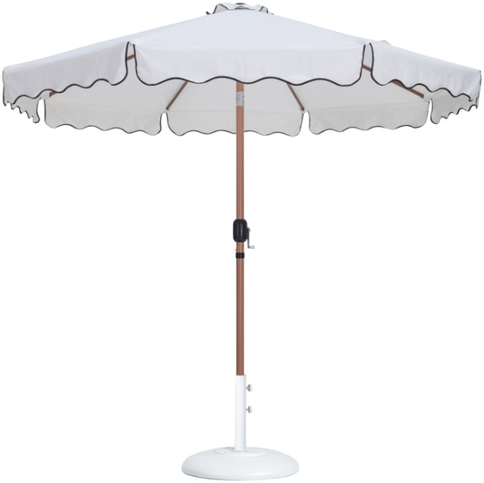 Escape from the sun's rays when you're basking beneath this Amalfi white fabric with black piping and teak aluminum patio umbrella with matte white base set. This umbrella and stand is an ideal option for adding shade to any area of your deck or patio.Read More
