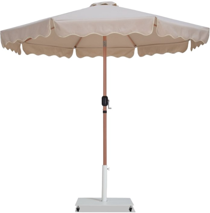Escape from the sun's rays when you're basking beneath this Amalfi beige fabric with cream piping and teak aluminum patio umbrella with matte white base set. On casters to make it a simple feat to move it from spot to spot.Read More