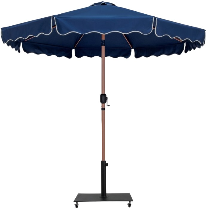 Escape from the sun's rays when you're basking beneath this Amalfi navy fabric with cream piping and teak aluminum patio umbrella with matte black base set. On casters to make it a simple feat to move it from spot to spot.Read More