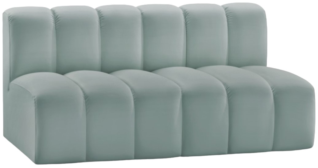 Unleash modern opulence with the Arc Vegan Leather Ottoman. Crafted for the modern connoisseur, this ottoman injects an air of refined luxury into any space. Its sleek silhouette, upholstered in supple mint green vegan leather, exudes timeless sophistication while the deep channel tufting adds textural intrigue, further elevating the chair's visual appeal.Read More