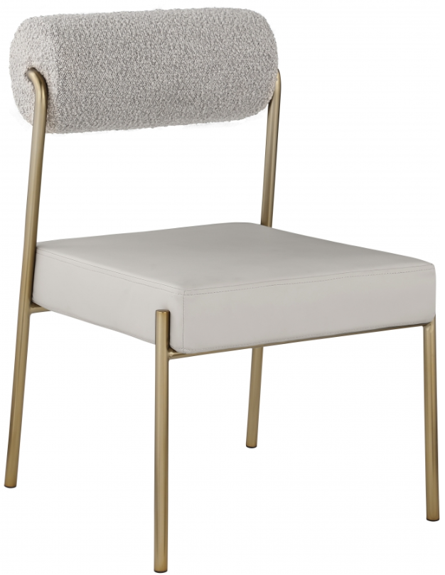 Transform your dining area with this Carly taupe vegan leather seat/boucle fabric back dining chair. Its taupe vegan leather seat provides you with a soft place to sit, while its rich taupe boucle back amps up the comfort level an extra notch. Its brushed brass iron frame ensures stability and durability.Read More