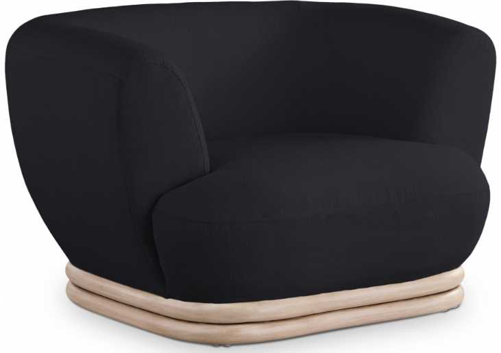 Featuring a rubber wood frame upholstered with rich black boucle fabric this chair is both soft and comfortable to kick back and relax in. Its solid rubber wood base in a natural oak finish provides a splash of color to this black piece.Read More