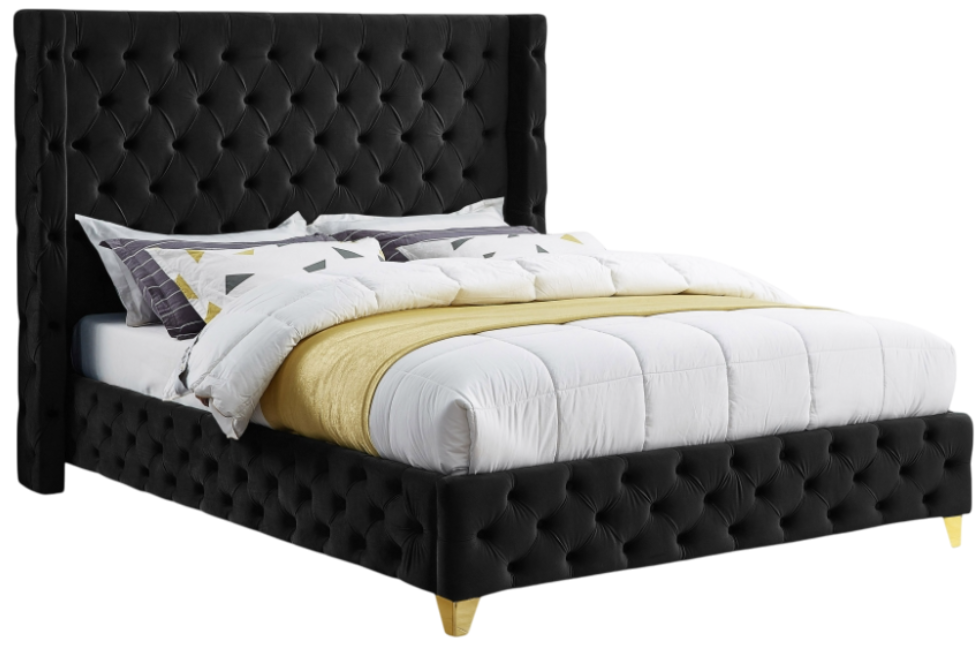 Bring luxury to the forefront when you add this Savan velvet queen-size bed to your room. Upholstered in rich black velvet from the top of its super-high headboard down to its footboard, this beautiful bed features deep button tufting and a wingback detail to make it a true standout in your space.Read More