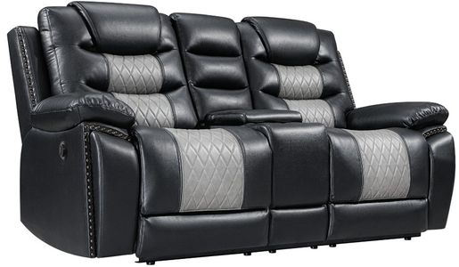Enjoy luxurious, cozy lounging with resilient foam cushions and pocket coil support. The two-tone black and gray fabric, made from a blend of 80% polyester and 20% pu, offers the soft touch and look of leather while remaining breathable. With distinctive details like nailhead trim, diamond stitch pattern seats, double wrapped headrests, and expert tailoring, this loveseat adds a touch of elegance to any home. Practical lifestyle features include extra storage in the center console, hidden pull-out cupholders under the armrests, and usb charging ports to keep your devices powered up. Plush pillowed arm and headrests, reclining backs, and comfortable footrests provide the perfect place to unwind. Find your ideal recline position with the touch of a power button. Upgrade your living space with the Nikko dual recliner storage console loveseat and enjoy unparalleled comfort and style in your home.
