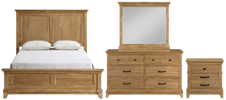 The Sunstone bedroom set blends warmth and elegance. Featuring a queen panel bed, dresser, mirror, and nightstand, it’s crafted from rich honey-finished wood with stylish detailing, offering comfort and timeless charm.Read More