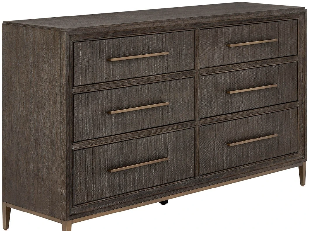 The Montclair dresser combines sophisticated storage with transitional elegance through six spacious drawers featuring rich cocoa finish and textural embossed cocoa fronts. Elevated on a sleek smoked gold metal base with felt-lined jewelry trays and soft-close guides, this piece delivers both luxury and functionality.Read More
