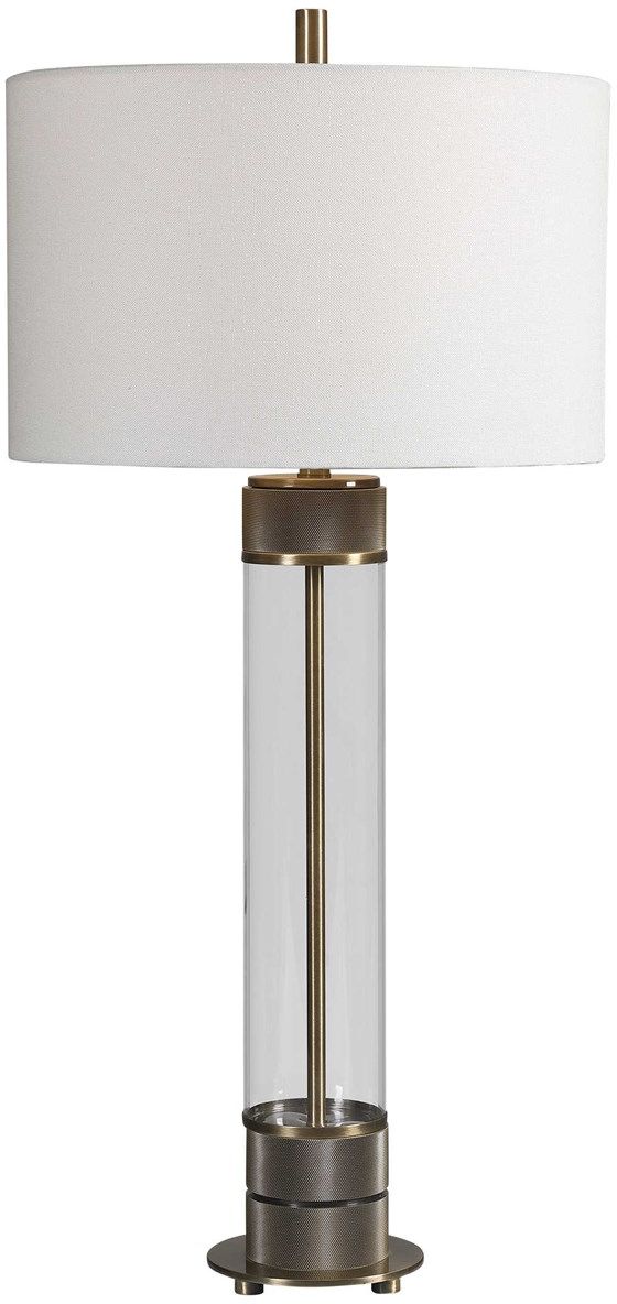 Showcasing a clean transitional look, this table lamp features a clear glass base accented with antiqued brass plated, heavy textured iron details for a soft industrial feel. The lamp is paired with a white fabric drum shade.Read More