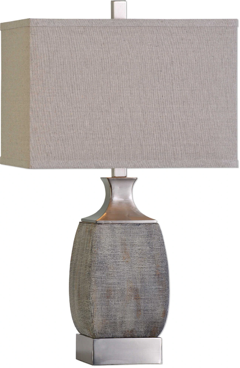 Heavily textured rust bronze ceramic accented with brushed nickel plated metal details. The rectangle hardback drum shade is a light beige linen fabric.Read More