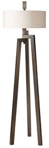 Hand forged metal finished in an antiqued plated brushed bronze with gold undertones. The round hardback drum is a white linen fabric. In-line floor switch. This sleek and stylish lamp will bring functionality and good looks to any space.