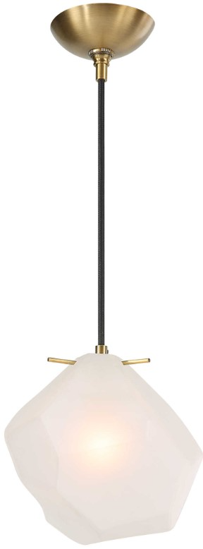 Frosted 8" geometric-shaped glass gives us the focal point for this celestial feeling 1 Lt. pendant accented with a rich matte antique brass finish. Supplied with 15' of black fabric-covered wire for adjustable installation with 1-60 watt max candelabra socket.Read More